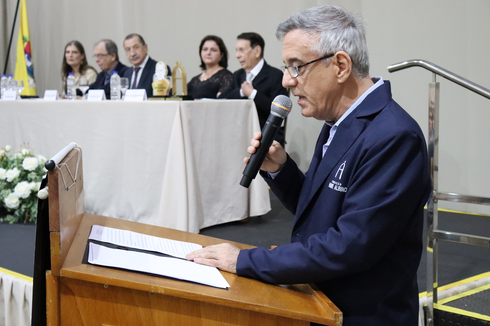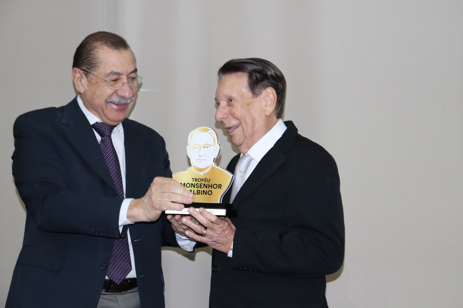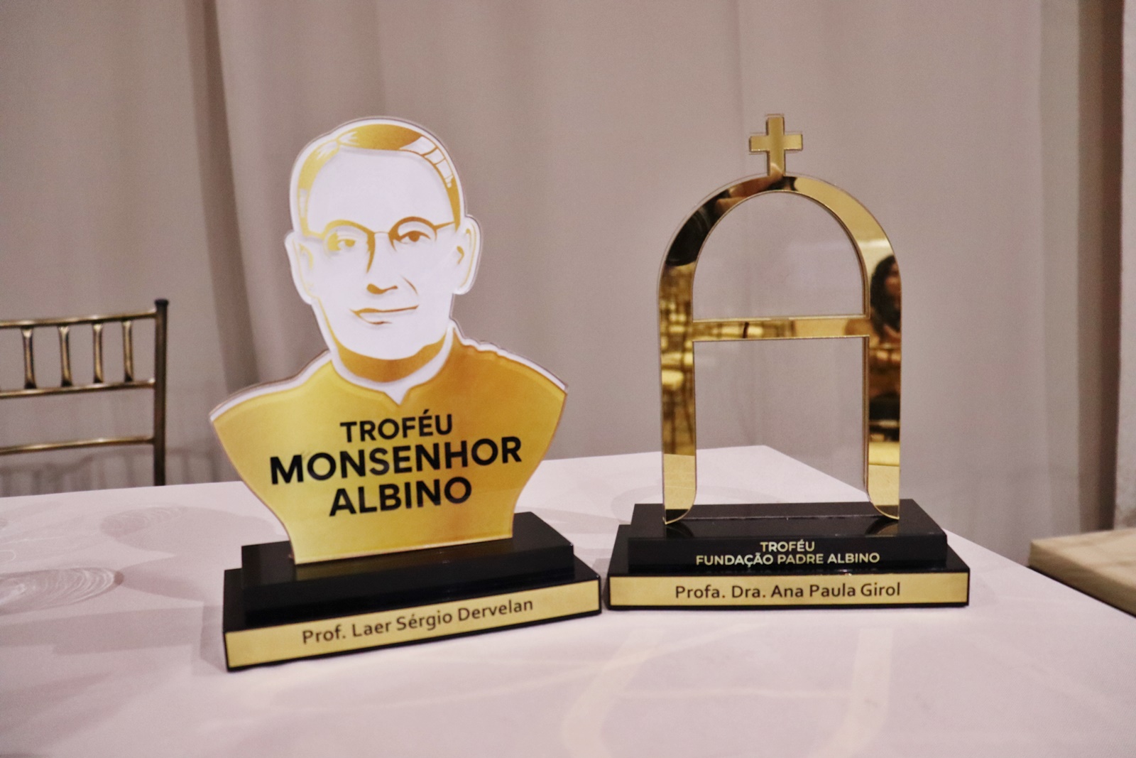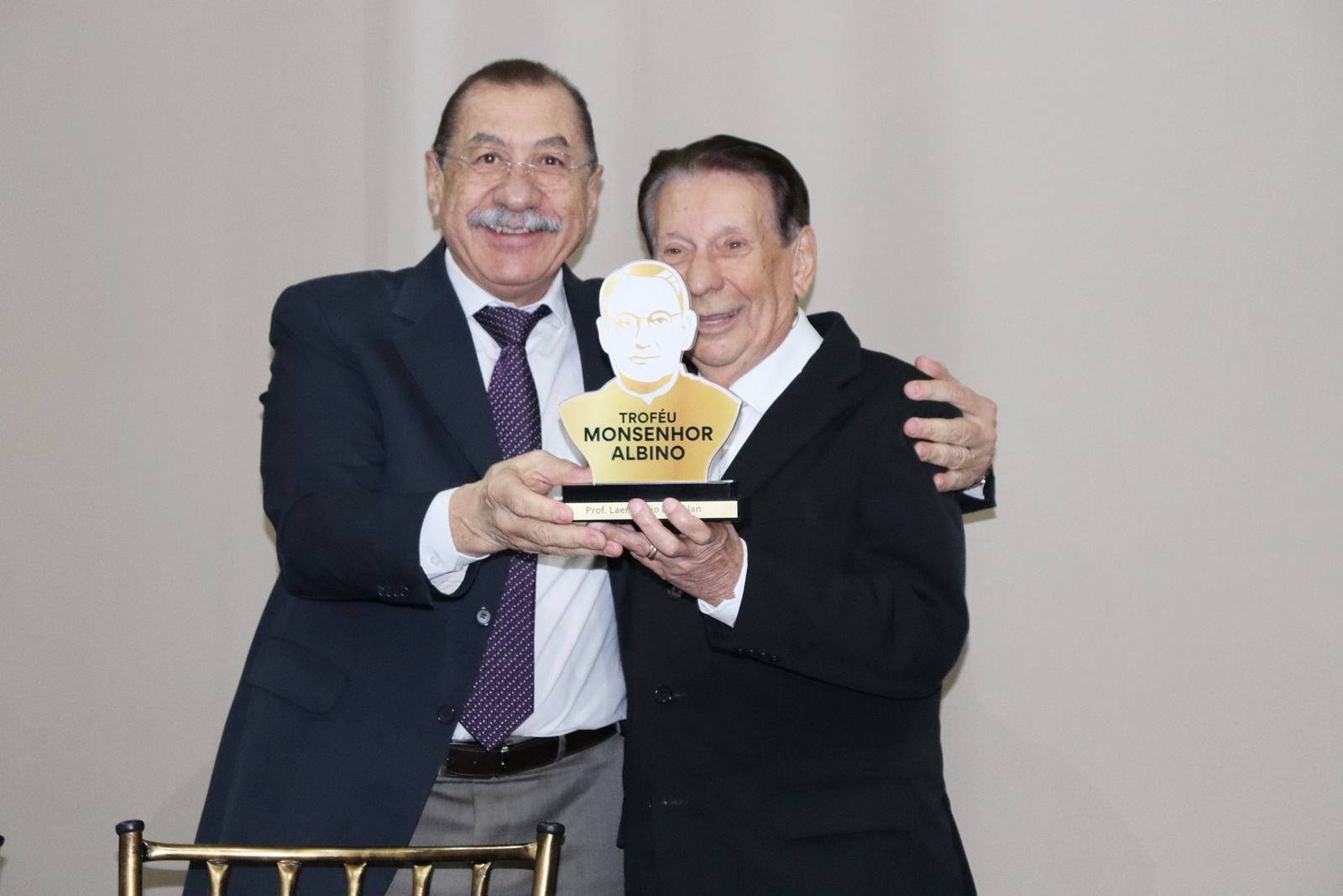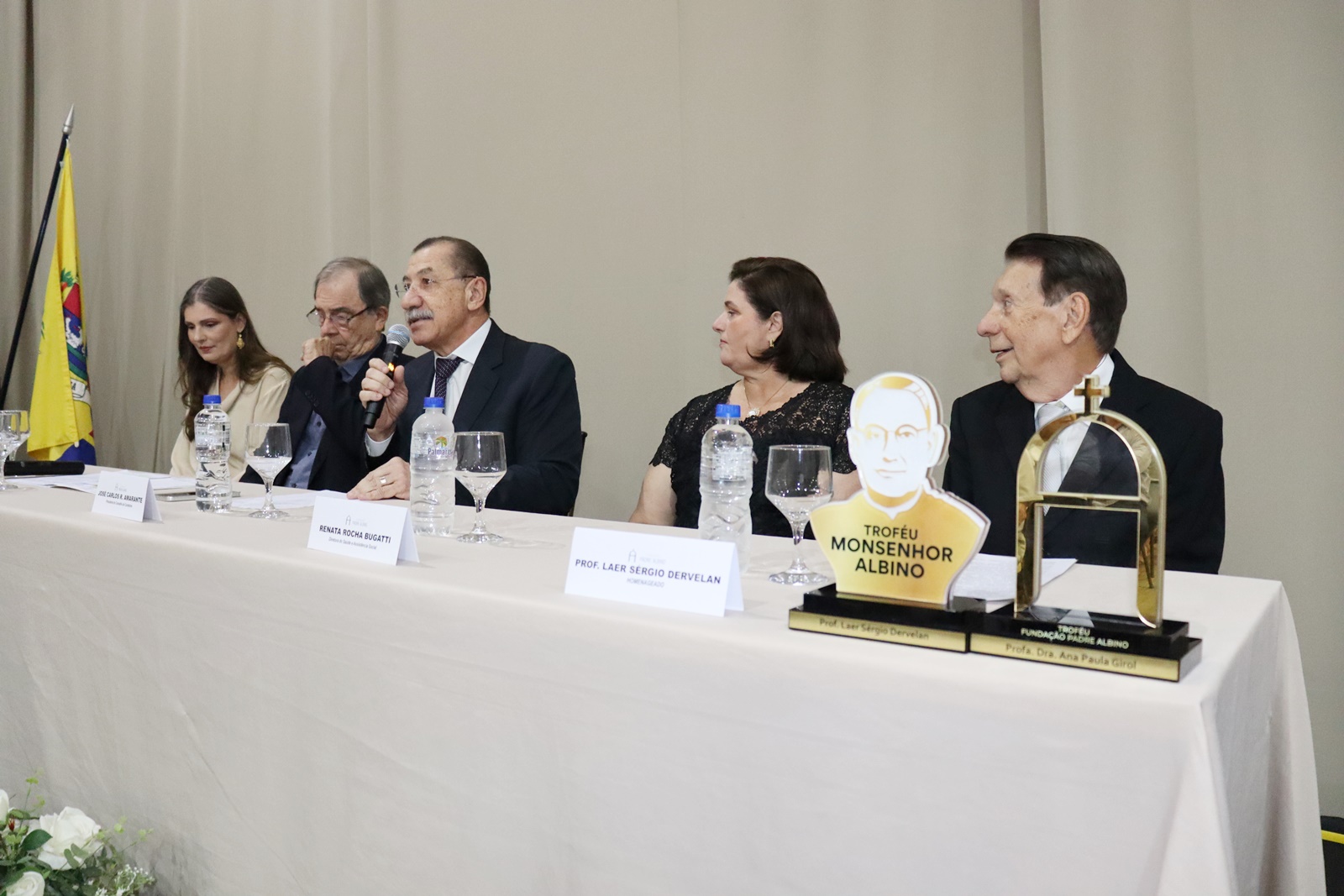 Na sequência foi a vez do conselheiro Prof. Laer Sérgio Dervelan receber o Troféu Monsenhor Albino, destinado a reconhecer pessoas que colaboraram com Monsenhor Albino ou que seguem seu espírito benemérito e cristão em trabalhos junto à Fundação. Antes da entrega, o conselheiro Dr. Nelson Lopes Martins destacou a trajetória profissional e pessoal do homenageado.