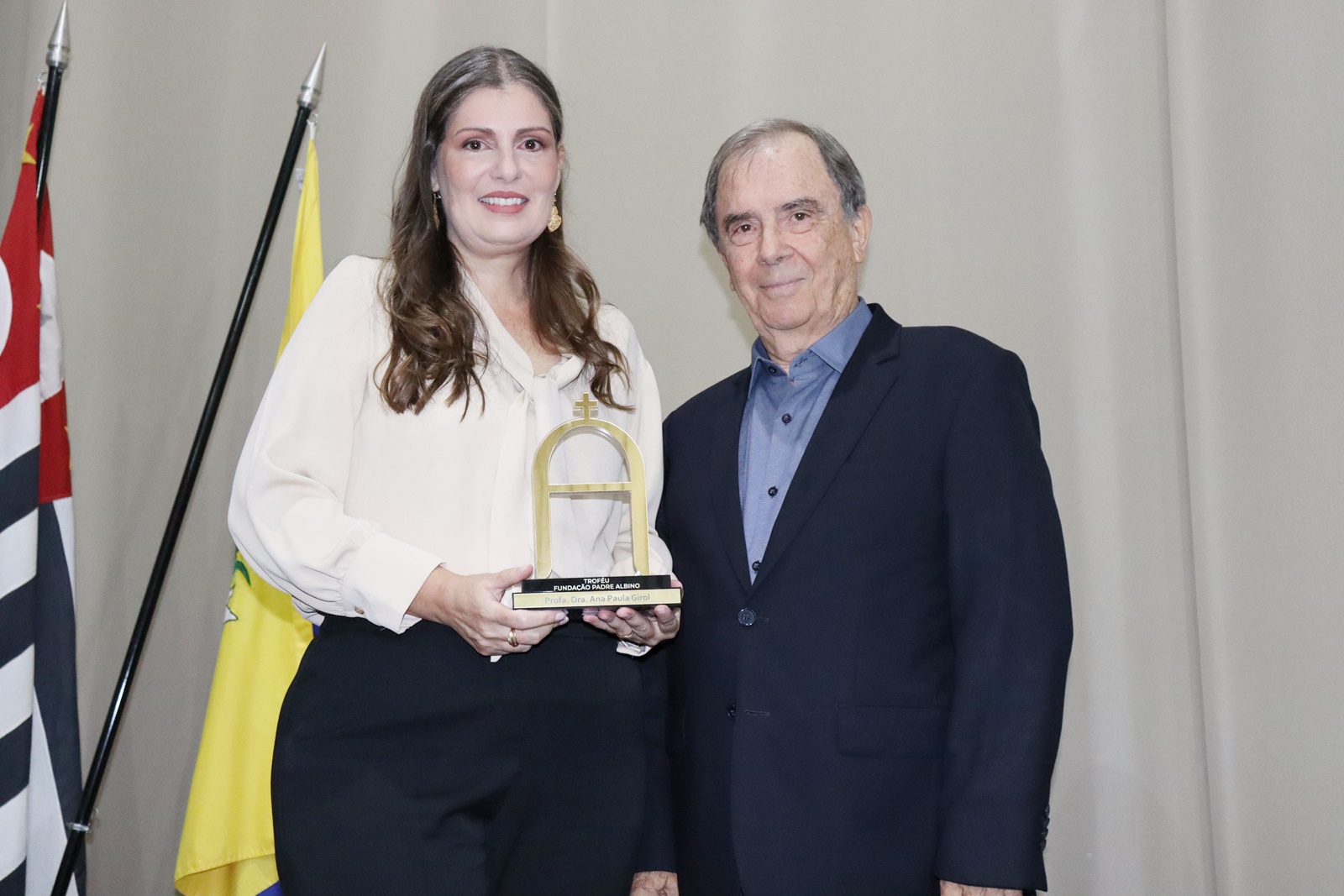 Profa. Ana Paula foi distinguida com o Troféu Fundação Padre Albino, concedido a colaboradores que se destacam pelos relevantes serviços prestados à instituição e cujo trabalho serve de estímulo aos demais colegas. O reitor da Unifipa, Dr. Nelson Jimenes, ressaltou o currículo da homenageada, que possui diversas especializações, ampla produção científica publicada em periódicos internacionais e que, no próximo mês, representará a instituição em congresso na China. “Um reconhecimento mais que merecido... uma representatividade da nossa instituição”, destacou.